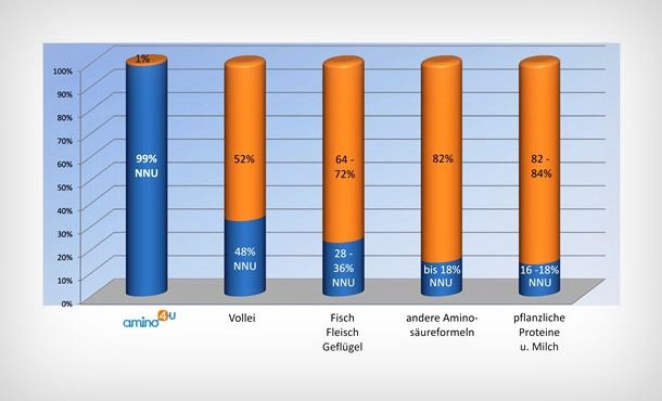Amino4u Pulver liefert als ideale Zusammensetzung das für den Menschen optimale Aminosäuremuster. Es stellt den höchsten Proteinnährwert überhaupt zur Verfügung und liefert zugleich die geringste Menge an belastendem Stickstoffabfall. amino4u hat nahezu keine Kalorien.