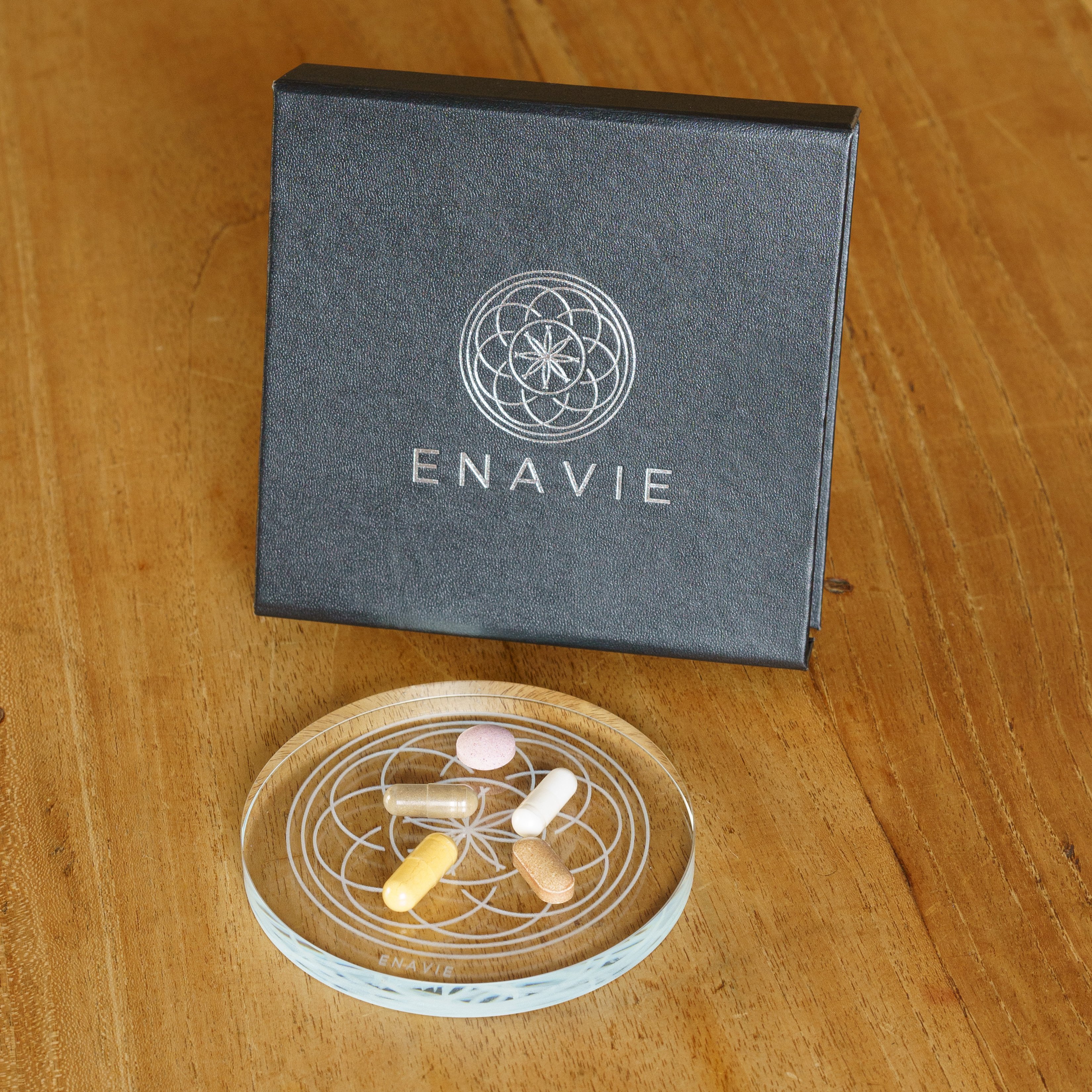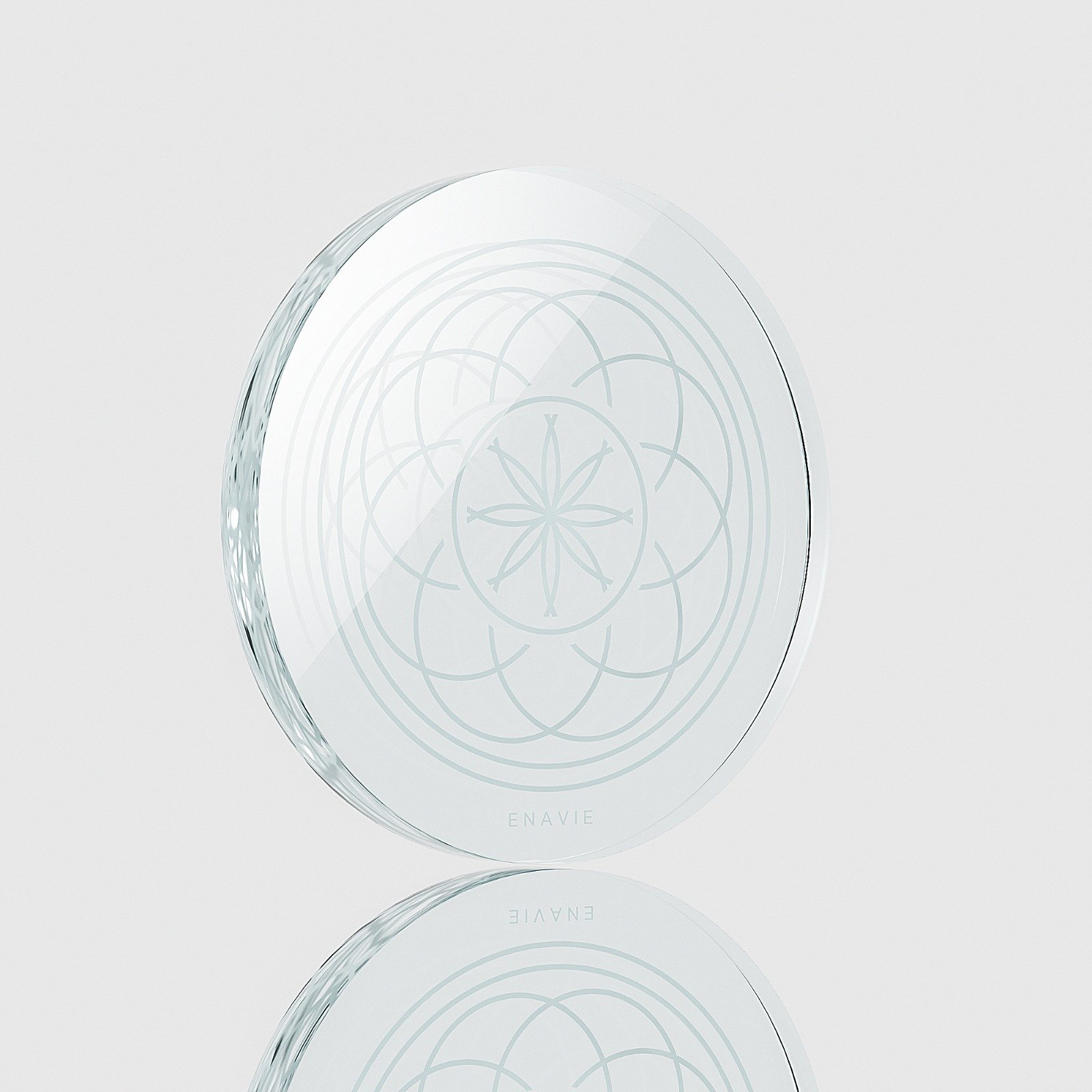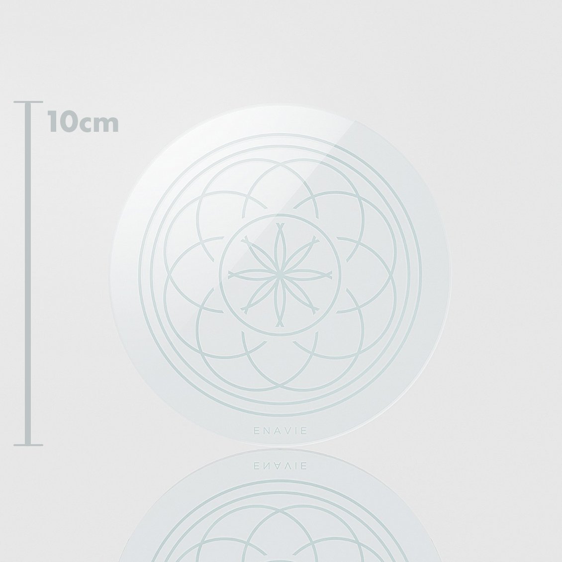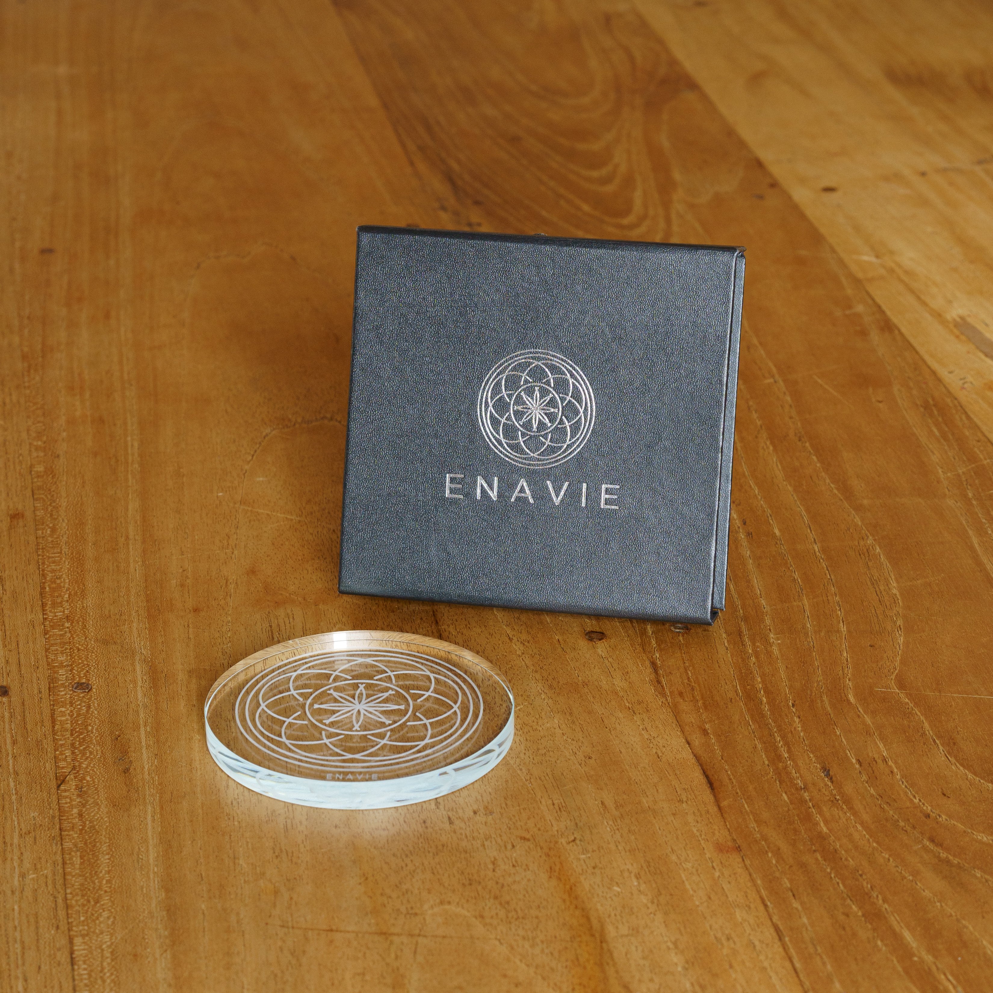 Die Single Version enthält eine ENAVIE HARMONY Energieplatte in den Maßen 10 cm (Durchmesser) x 1 cm (Höhe). Das hochwertige Glas wurde mit einem speziell patentierten Laserverfahren veredelt. Mittig in der Platte sitzt das lasergravierte Heilzeichen und der Schriftzug ENAVIE, der dir noch mehr Energie im Leben schenkt. Die Energieplatten sind spülmaschinenfest und lassen sich sehr gut reinigen.