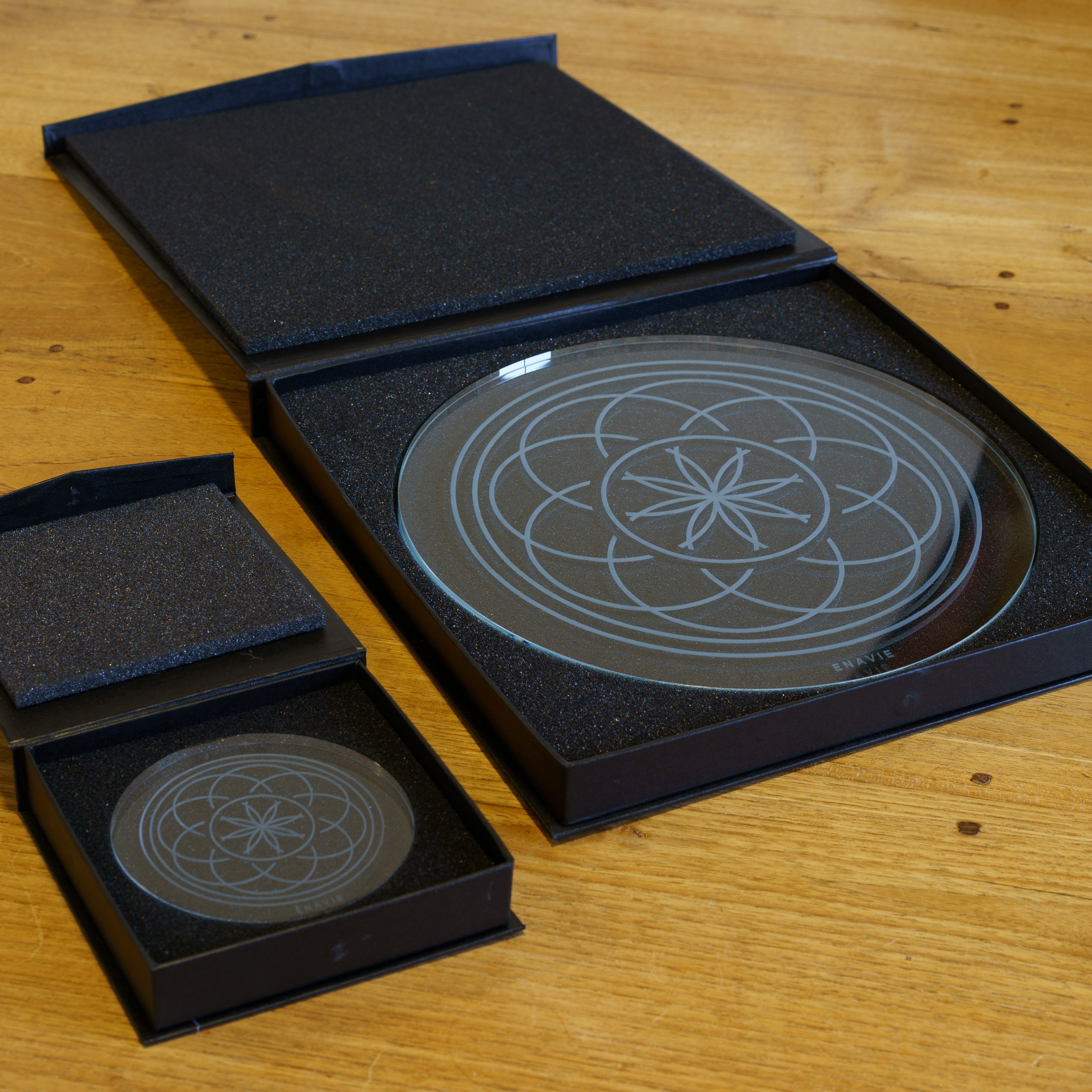 Du erhältst jede Energieplatte zusammen mit einer hochwertigen dunklen Schachtel mit einem silbernen ENAVIE Logo. So eignen sich die hochwertigen Glasplatten auch ganz wunderbar als Geschenk für liebe und wertvolle Menschen.