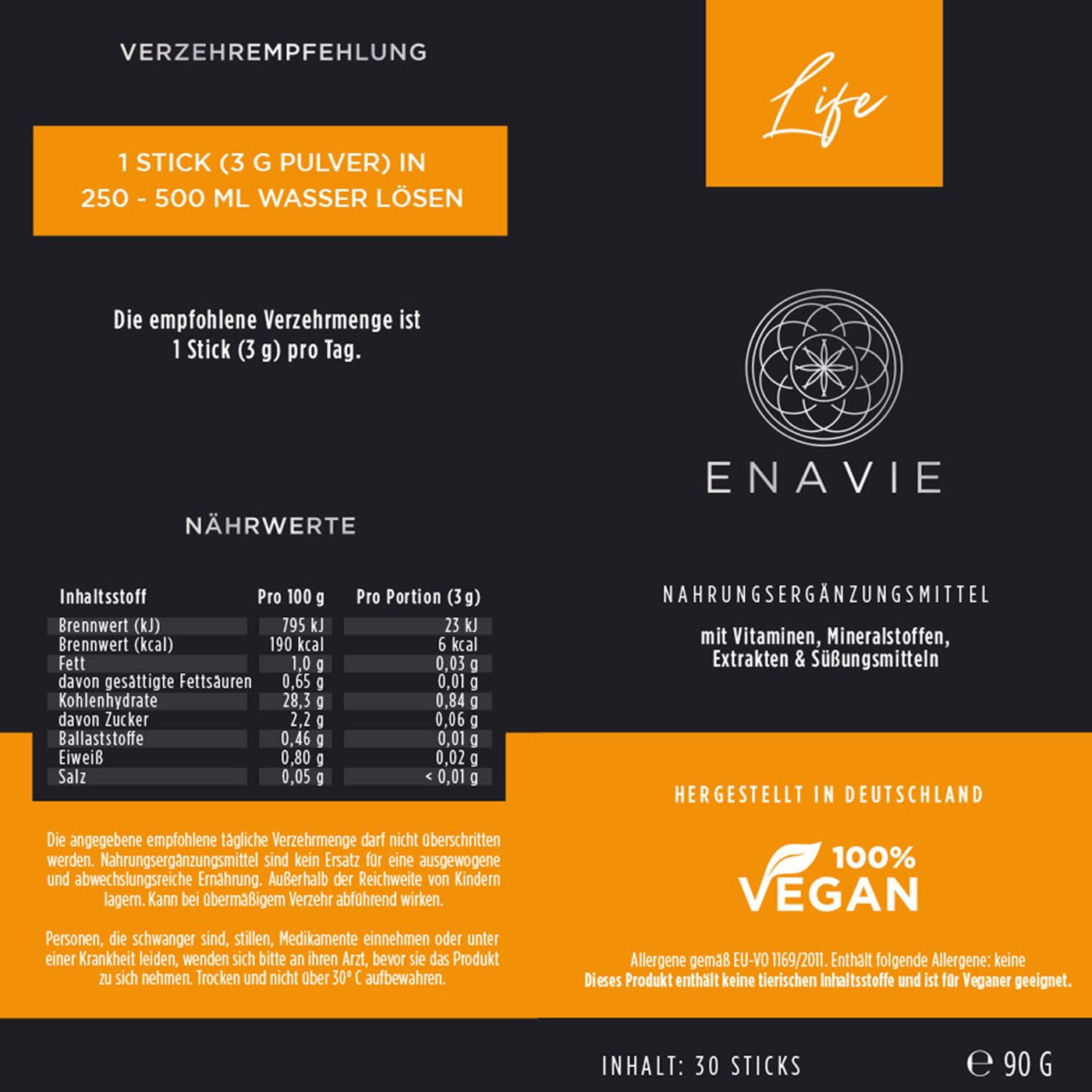 Das Starter Pack enthält eine Packung ENAVIE LIFE mit 30 Sticks für 30 Tage. Das Vitalstoff-Konzentrat für die ganze Familie lässt sich perfekt in Wasser auflösen. Der Geschmack ist leckere Blutorange. Das Getränk ist leicht süß und sehr gut bekömmlich. Bei Bedarf kannst du das Vitamin Plus Pulver auch in Saft o.ä. auflösen.