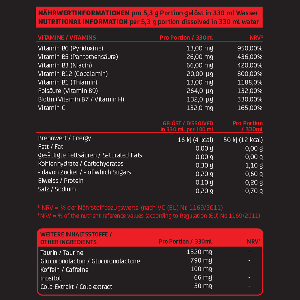 Mit Koffein, Taurin, Glucuronolacton, Inositol, Cola-Extrakt und hochdosierten B-Vitaminen. Der Geschmack? Klassisch Cola, am besten Eiskalt. Die Wachmacher Koffein, Taurin, Glucuronolacton und Inositol erhöhen den Stoffwechsel. Die hochdosierten Vitamine B3, B5, B6, B12 tragen zur Verringerung von Müdigkeit und Ermüdung und einer normalen psychischen Funktion bei.