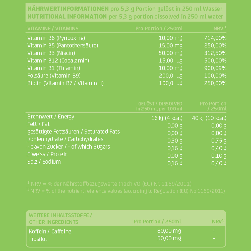 Vitamin B6, Vitamin B12 und Niacin tragen zur Verringerung von Müdigkeit und Erschöpfung bei, Koffein hilft die Konzentrationsfähigkeit zu verbessern und den Wachheitsgrad zu erhöhen.