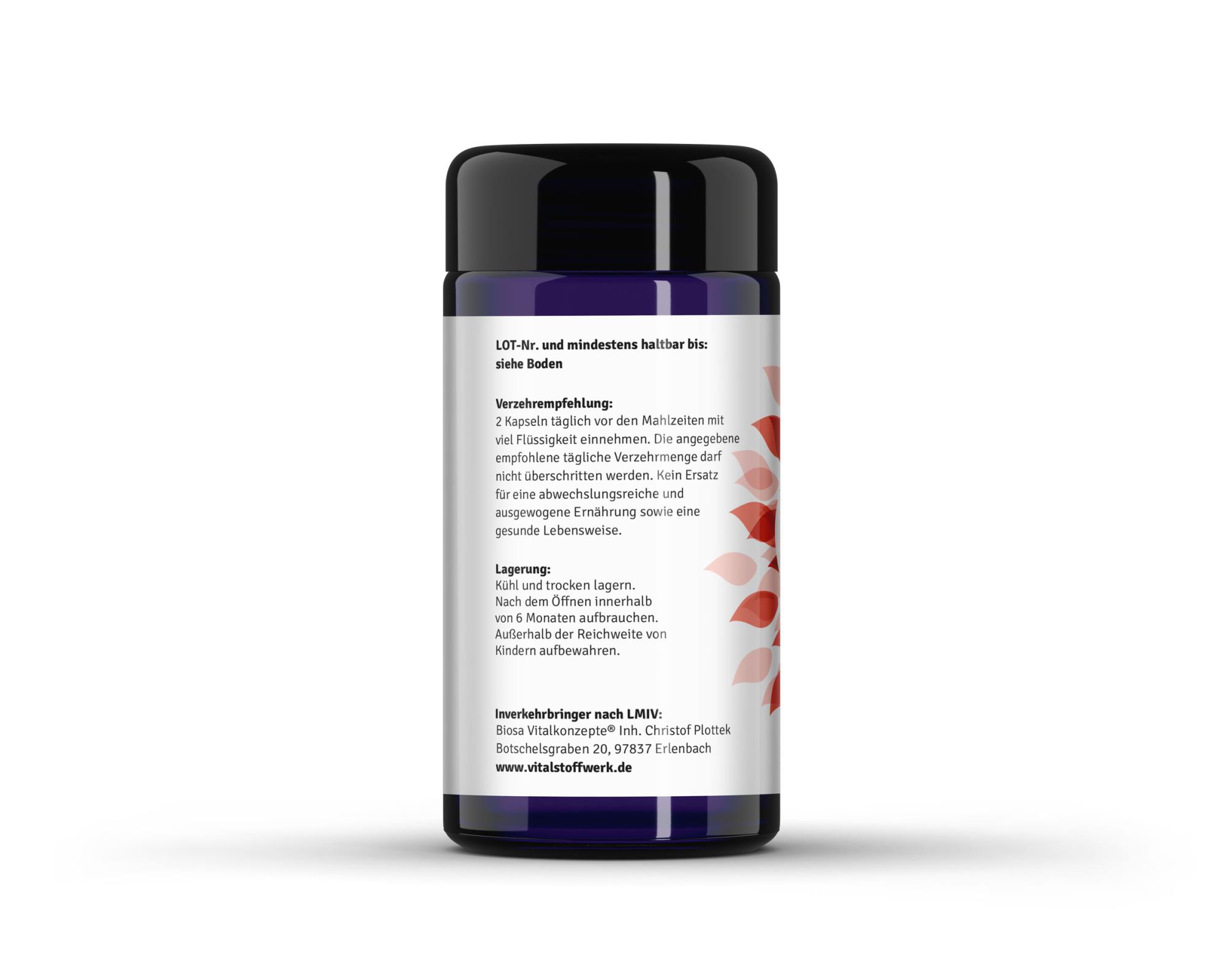 Verzehrempfehlung: 2 Kapseln täglich vor den Mahlzeiten mit viel Flüssigkeit einnehmen.