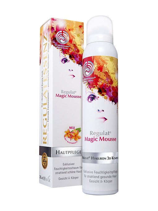 Nachdem man das Regulat® Magic Mousse gut geschüttelt hat, drückt man ein kleines Schaum-Wölkchen in die Handfläche. Sofort fällt einem der sinnesverwöhnende Duft auf. Durch die lockere Schaum-Textur lässt sich das Mousse ebenmäßig und ganz leicht im Gesicht und auf dem Körper verteilen. Es zieht angenehm schnell ein und hinterlässt ein seidenglattes und erfrischtes Hautgefühl. Selbst trockene oder gereizte Hautstellen erstrahlen wieder in voller Frische.