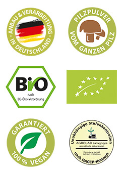 Die Zucht und die Verarbeitung zu Pilzpulver-Kapseln erfolgt vollständig und ausschließlich in unserem Betrieb in Limeshain, Deutschland. Der reife, frisch geerntete Pilz wird sofort nach der Ernte in unserem speziellen, schonenden Trocknungsverfahren getrocknet, mit einer wassergekühlten Mühle schonend zu Pulver gemahlen und in HPMC-Kapseln abgefüllt. Eine Zwischenlagerung (z.B. im Kühlhaus) erfolgt nicht. Durch die sofortige, schnelle und schonene Verbarbeitung gewährleisten wir, dass alle wichtigen Inhaltsstoffe erhalten bleiben und der Pilz nicht seine naturgegebenen, nützlichen Eigenschaften für die menschliche Ernährung verliert. Anteile von Hirse können enthalten sein.