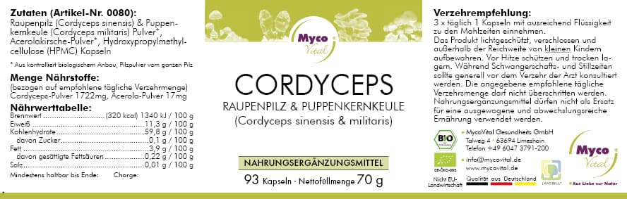 Chinesischer Raupenpilz (Cordyceps sinensis) Pulver*, Puppenkernkeule (Cordyceps militaris) Pulver*, Acerolakirsche-Pulver*, Hydroxypropylmethylcellulose (HPMC) Kapseln