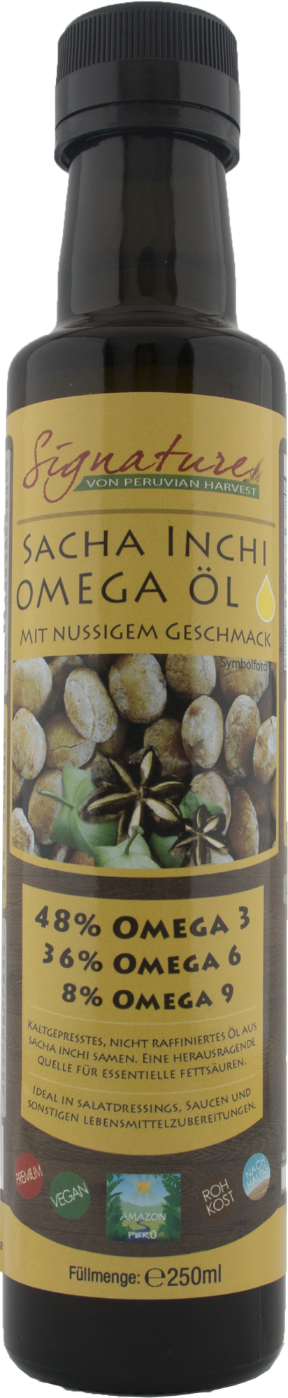Kaltgepresstes nicht raffiniertes Öl aus Sacha Inchi Samen. EineHerausragende Quelle für essentielle Fettsäuren.
