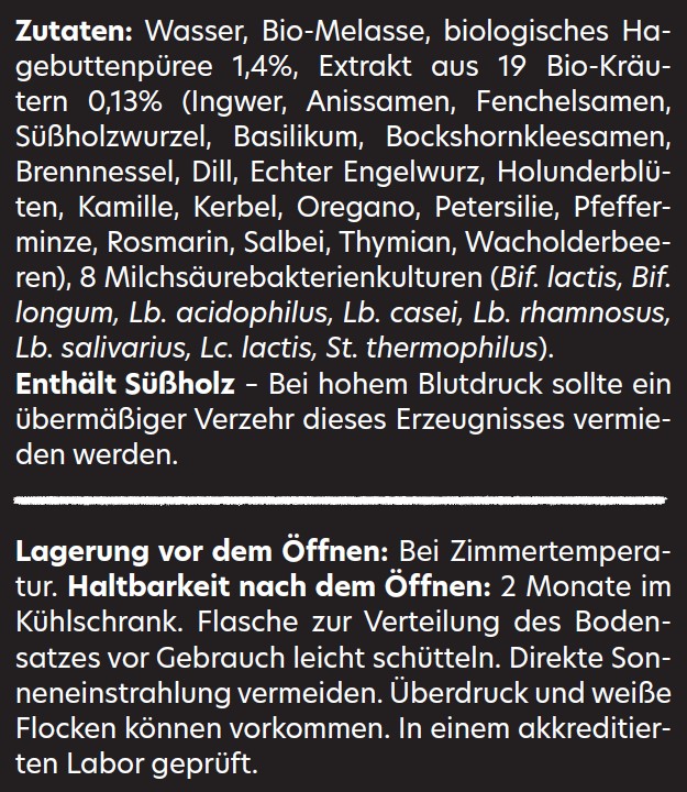 - Aktive Milchsäurekulturen und ein Auszug aus 19 verschiedenen Kräutern - alle aus kontrolliert biologischem Anbau(kbA).